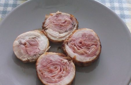 En las carnicerías lo venden ya en una malla. Suelen ser muslos del pollo rellenos de bacón.