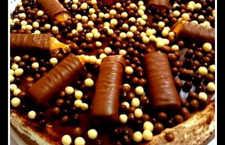 Una base de galletas con chocolate y una mousse a base de nata chocolate y dulce de leche con un chocolate encima decorada con galletas de chocolate y caramelo y bolitas de chocolate crujiente