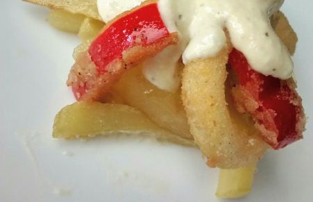 Un buen bocado de patatas con pimientos y cebolla y una buena salsa por encima que le den un buen sabor, una receta hecha para 4 - 5 personas. Espero que les guste y que os salga exquisita.