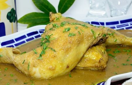 Pollo con salsa de cerveza y cebolla