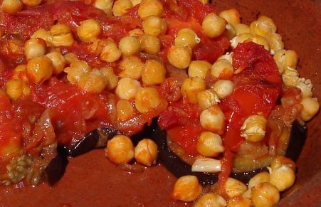 Un plato vegetariano a base de berenjena, tomate y garbanzo muy simpática para estos días de verano.
