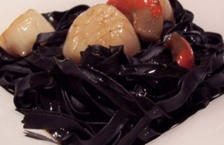 Tagliatelle con tinta de calamar, vieiras en vermut