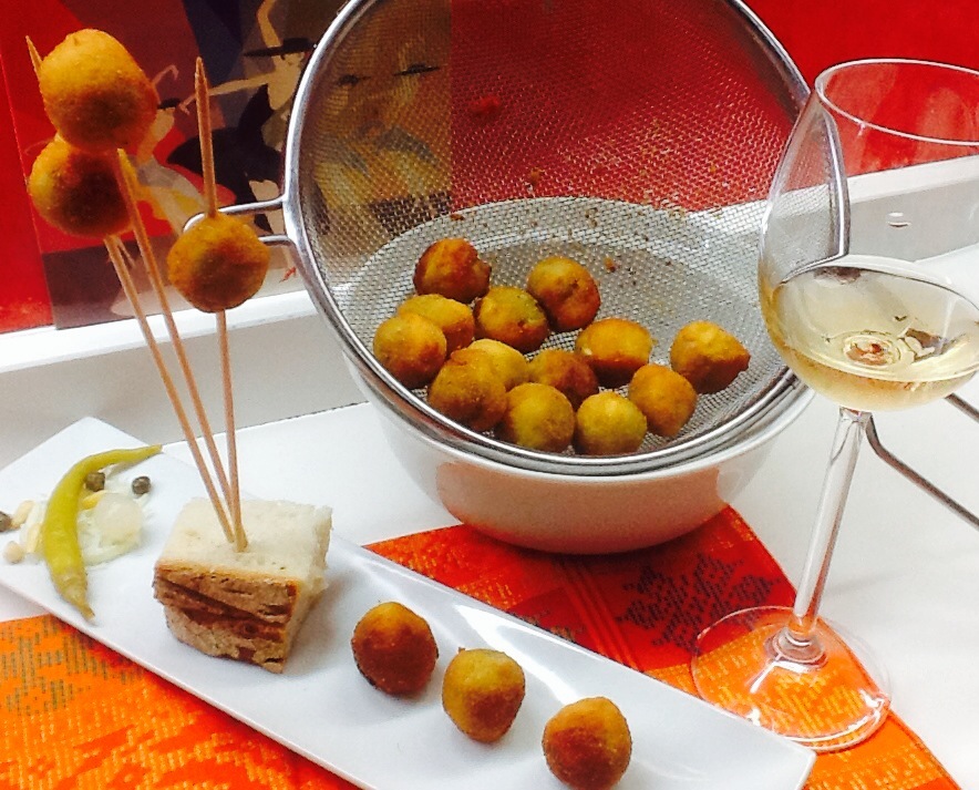 Aceitunas fritas rellenas de bacon, queso y pimiento rojo
