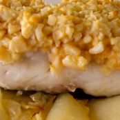 Merluza al horno rellena de gulas y gambas sobre cama de patatas panadera