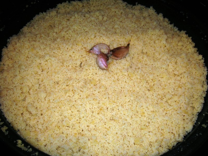 Freir los dientes de ajo en un poco de aceite de oliva, no hace falta pelarlos, reservar