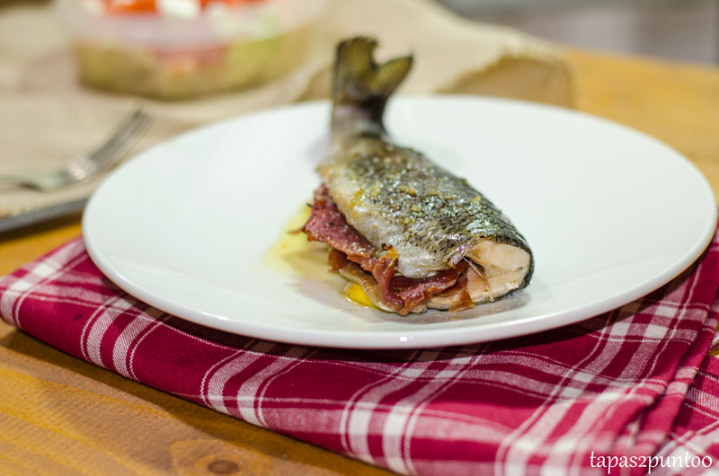 Deliciosa merluza al horno con un relleno de marisco preparado con gambas y mejillones