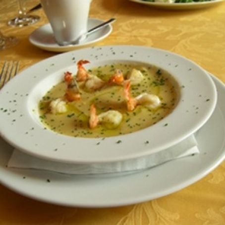 Poner en una cazuela las zanahorias, las patatas, la mantequilla, las hierbas, la sal, la pimienta, añadir 2 litros de agua y cocer durante 15 minutos a fuego lento, agregar los trozos de pescado y los gambasy cocinar 10 minutos.