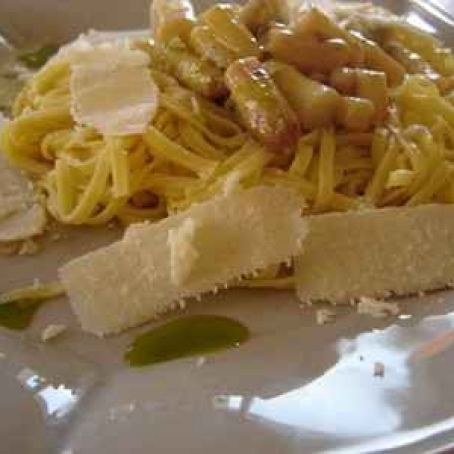 Coloque en un plato los fetuccini, los espárragos en el medio, algunas virutas de parmesano por encima.