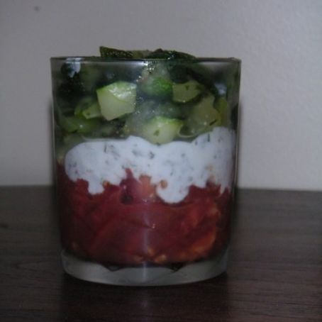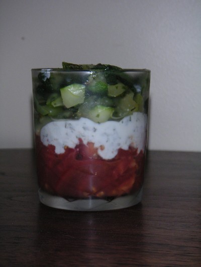 en los vasitos, coloca un poco de tomate y luego el queso blanco. Coloca en la nevera