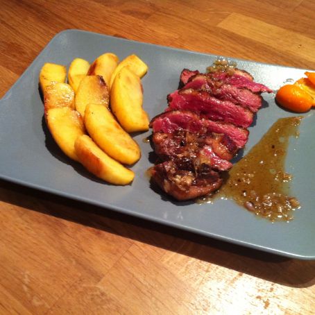 Cortar el pato en rodajas y colocarlo en un plato intercalando con las manzanas.