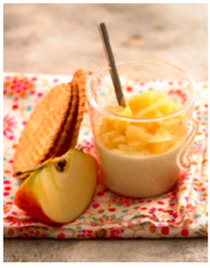 Mezclar la crema y gelatina que se ha escurrido previamente y llevar a fuego. Una vez que hierva, retirar la cacerola del fuego. Mezclar bien para disolver. Vierta la mezcla en 4 copas y colocar en la nevera durante 3 horas. Preparar la salsa: Pelar y quitar el corazón de las manzanas. Cortar en cubos pequeños y verter en una cacerola con 1 cucharada de agua y el azúcar restante. Cocinar a fuego lento durante 15 minutos, revolviendo ocasionalmente. Deje enfriar y verter sobre la Panna cotta antes de servir.