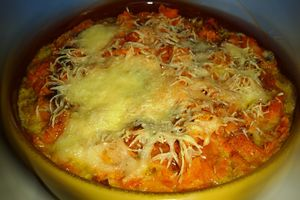 En una fuente para horno, pone la mitad de las patatas dulces, agregua el pescado y la salsa, cubre con el resto de las patatas dulces y espolvorea con el queso rallado restante.