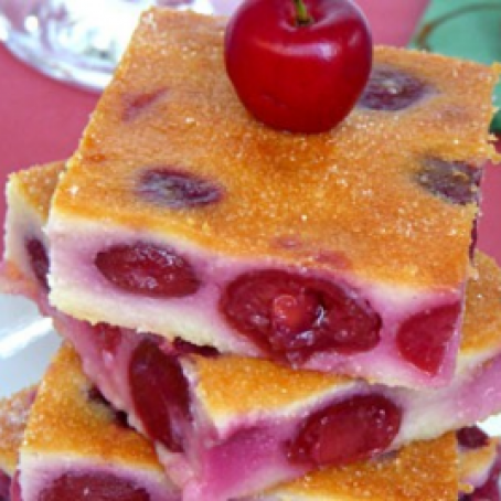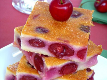 La mantequilla y espolvorear con el azúcar del molde. Divida las cerezas en la parte inferior y se vierte la mezcla sobre. Hornee de 35 a 40 minutos.