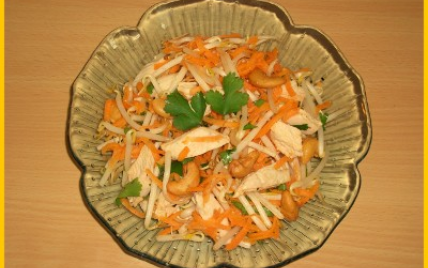 Pelar y rallar las zanahorias y mezclar con los brotes de soja, el pollo frío, las nueces de anacardo, aceite de oliva y jugo de limón.