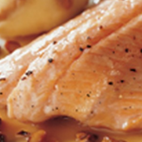 Servir los filetes de trucha asada con el puré, salsa de verbena y champiñones fritos.
