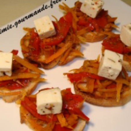 Espolvorear el pan tostado con juliana de verduras. Coloque un cubo en la parte superior de feta marinado.
