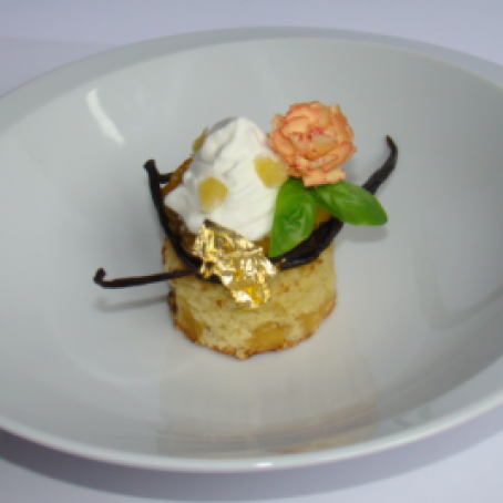 Emplatado: En cada plato, colocar una ronda de mirlition, ½ melocotón arriba atado con una vaina de vainilla. Agregar la chantilly de albahaca. Decorar con una hoja de albahaca, una flor y algunos calissons y hoja de oro.