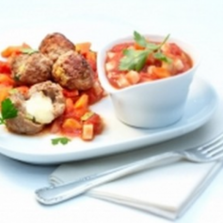 Corte el queso en cubos de aproximadamente 1.5 cm (20 a 24 unidades). Divida la preparación picada, y cib rir cada cubo de queso con la carne picada y formar la albondiga. Saltear 8 a 10 minutos en aceite a fuego medio. Servir con salsa de vegetales.