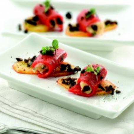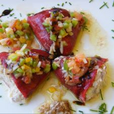 Pimientos rellenos de brandada de bacalao con aceitunas de España
