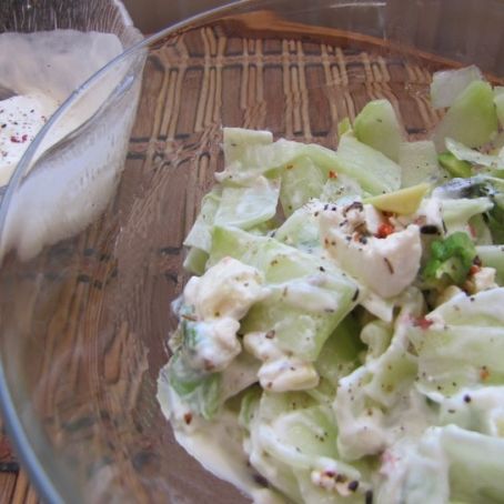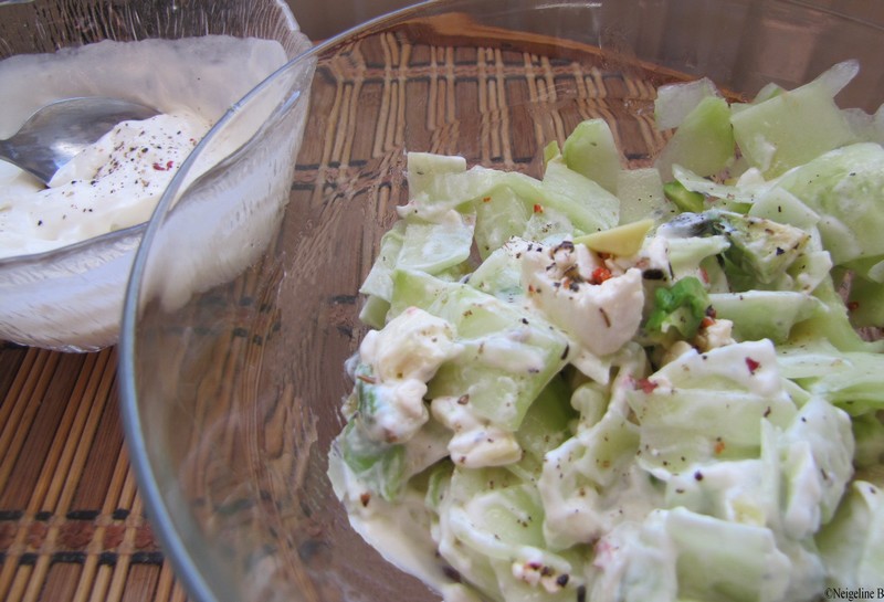 Ensalada de pepino, aguacate, queso feta y salsa Philadelphia