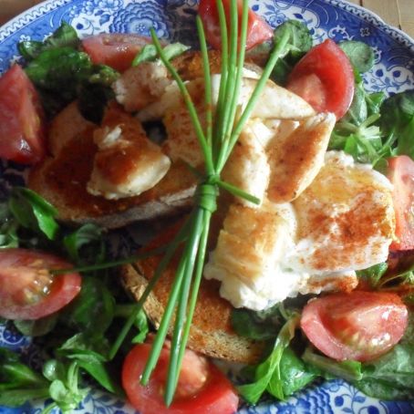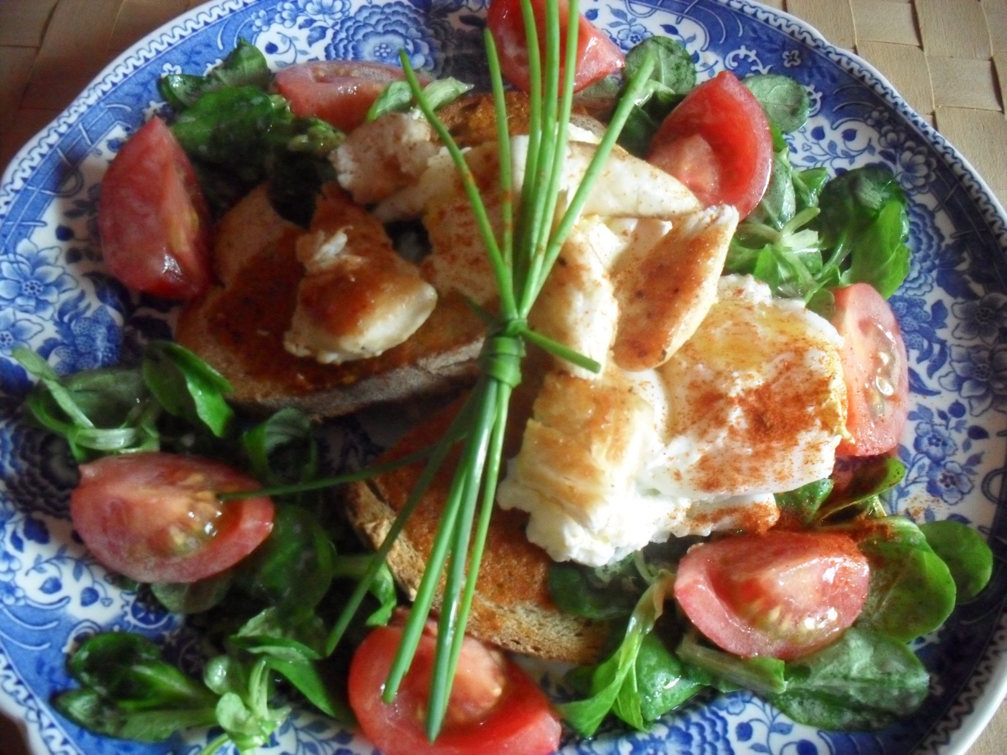 Ensalada gourmet con tiras de pollo y huevo escalfado