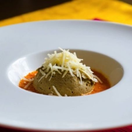 Cúpula de berenjenas confitadas sobre sopa de gazpacho