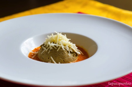 Necesitareis un molde con forma de semi-esfera, si no lo tenéis ponéis hacerlo en flaneras o en cualquier otro molde. Untar el molde con un poco de aceite para desmoldar mejor. Vertéis la mezcla anterior y metéis al horno 20 minutos a 150°C. Pasado el tiempo, retirar del horno y desmoldar. Vamos con el emplatado. Ponemos en el fondo de plato 3-4 cucharadas de gazpacho y encima nuestra cúpula de berenjenas. Podeis rallar un poquito de queso y ponerla por encima para decorar.