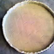 Untamos un molde bajo redondo, aproximadamente de 30 cm de diámetro, con mantequilla. Colocamos la lámina de masa quebrada. Hacemos una pequeña decoración doblando los bordes. Pinchamos la superficie repetidas veces con un tenedor. Colocamos el papel de hornear por encima y, si queremos, unas legumbres para que hagan peso.