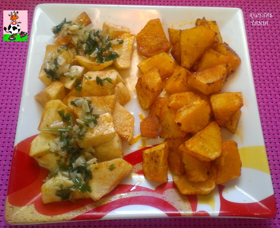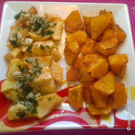 Pelamos, lavamos y troceamos las papas (patatas). Las freímos y reservamos. En una sarten ponemos un chorito de aceite y sofreímos los ajos picaditos,añadimos unas 5 cucharadas de vino blanco y una cucharada de azúcar moreno,removemos,dejamos que reduzca el vino y ponemos el perejil picadito. En otra sarten ponemos un chorrito de aceite de oliva y una cucharada de pimentón picante,removemos para mezclar los ingredientes. Ponemos la mitad de las papas en la sarten del aceite con el pimentón y damos unas vueltas para mezclar bien. Las otras papas las ponemos en un plato y añadimos por encima la otra mezcla de ajo,perejil,vino blanco y azúcar moreno, colocamos al lado las papas con el pimentón y a comer!!! Están riquísimas ideal para acompañar unos filetes de pechuga empanada como hice yo. Rico,Rico,Rico :D