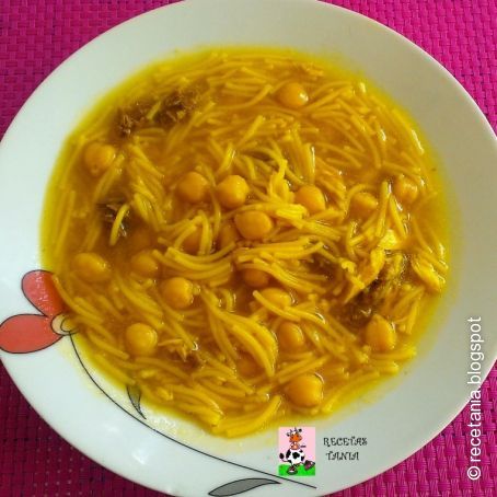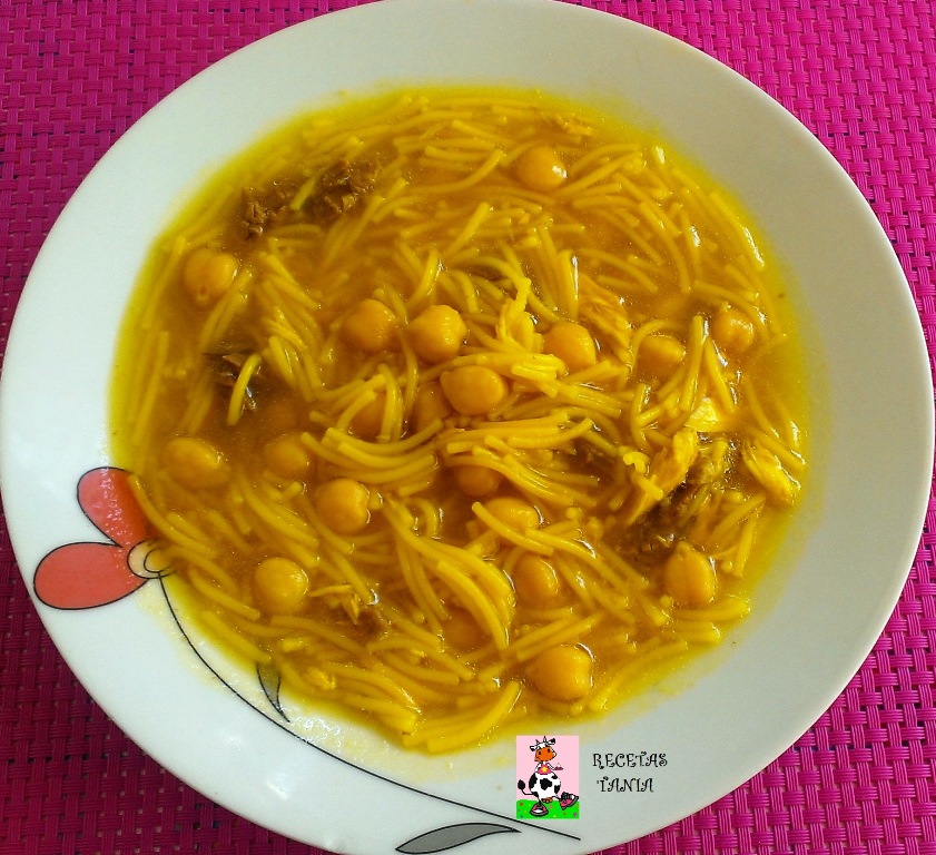 Añadimos un poco de colorante alimentario al caldo de pollo y añadimos la carne del pollo, de ternera desmenuzada y los garbanzos. Calentamos el caldo y cuando comience a hervir echamos los fideos y la sal. Bajamos el fuego y dejamos hasta que los fideos estén tiernos. Añadimos unas hojitas de hierba huerto... Y a comer esta riquísima sopa de pollo!!!