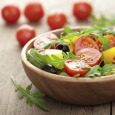 Sacamos la pizza del horno y cubrimos con la ensalada. Salpimentamos y regamos con un chorrito de aceite de oliva antes de servir.