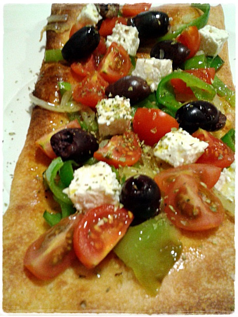 - 1 base de pizza (yo uso las de Lidl (Trattoria Alfredo), buenísimas); tomates cherry al gusto; 1/2 pimiento verde; queso feta; 1/2 cebolla; un puñado de aceitunas negras deshuesadas (yo usé de Kalamata que compré en la semana de Grecia de Lidl); aceite de oliva; sal; pimienta negra; perejil fresco; orégano; sal Maldon o sal gorda.