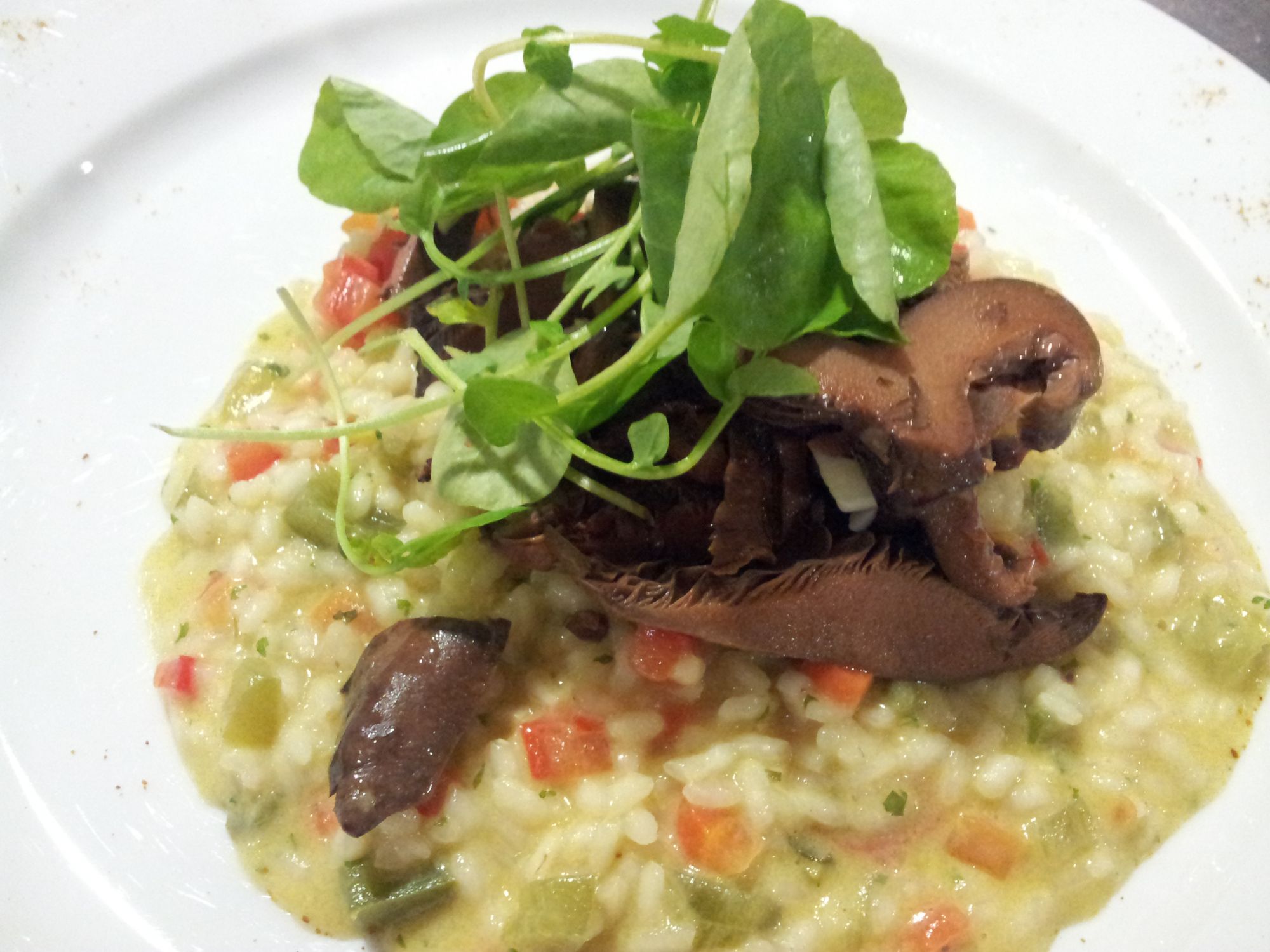 1. En un plato hondo poner el arroz cremoso, añadir las setas y coronar con las hojas de berros.