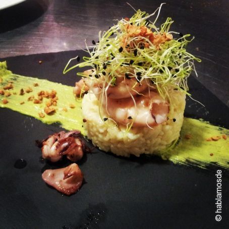 Risotto al parmesano, espuma de aguacate al estragón y salteado de chipirones con germinados de cebolla