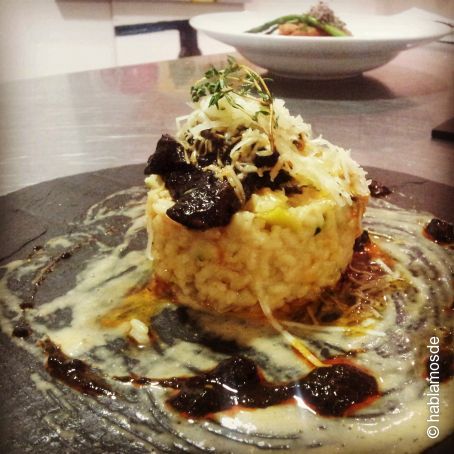 Risotto en manteca de queso a la esencia de curry amarillo, crema de mejillones picantes y calamares en su tinta en conserva con lascas de queso mantecoso