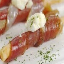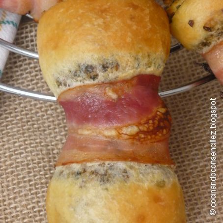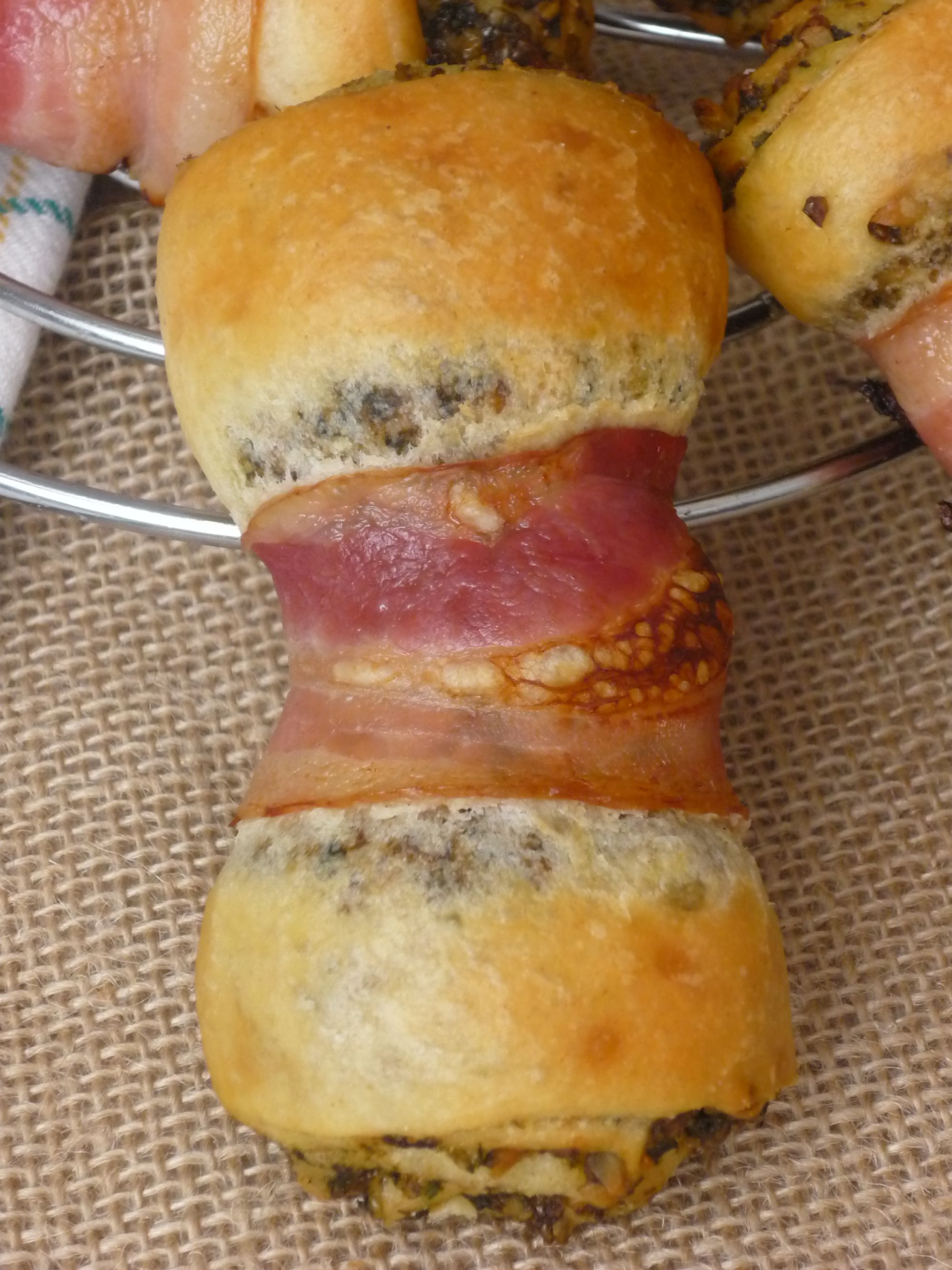 Rollitos rellenos de pesto de espinaca envueltos en bacon