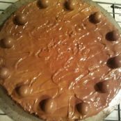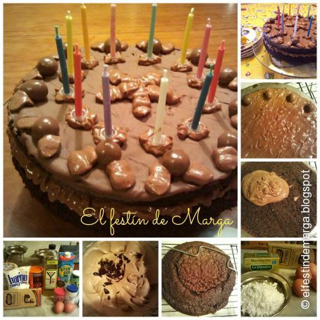 Con el chocolate derretido, cubro con un pincel una de las tartas. A mí me gusta dibujarle unas ondas con el pincel, no dejarlo completamente liso. Lo adorno con 12 Maltesers. Para que me queden bien colocados, pongo primero cuatro, formando una cruz. Después pongo dos más en el hueco entre cada dos. Meto esta tapa de la tarta en el congelador, para que se endurezca rápido el chocolate.
