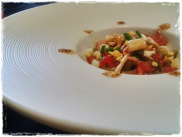 Preparamos la vinagreta mezclando todos los ingredientes y emulsionando bien. Aliñamos la ensalada y servimos con cebollino picado.