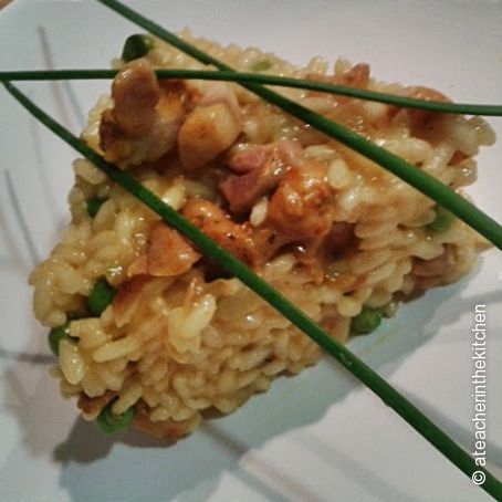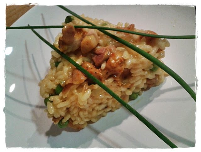 • 00 grs de arroz Arborio (no es fácil de encontrar, yo lo compré en Aldi, pero no siempre lo hay, si no lo encontráis, usad SOS, nunca Brillante o cualquier tipo de arroz largo); 150 grs de pollo al curry (yo lo compro en ya hecho en la pollería pero si no lo encontráis podéis hacerlo vosotros mismos, cortando una pechuga de pollo entera a trocitos y añadiéndole curry, la dejamos reposar una hora como mínimo antes de usar); 2 cucharadas de guisantes; 1 cucharada de queso Montasio o similar; 1 cucharada de aceite; 1 cucharada de mantequilla; sal; 1 l de caldo de pollo.
