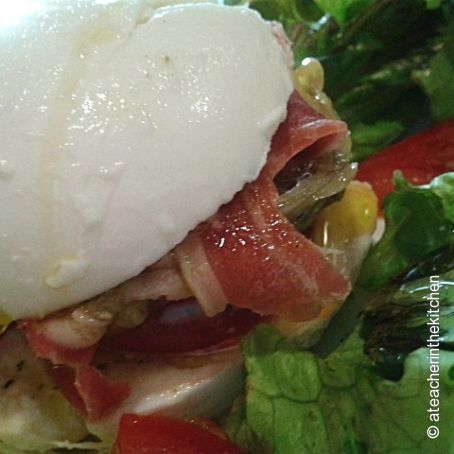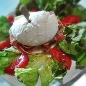 Cortamos la mozzarella por la mitad y ponemos dos rodajas de tomate sobre una de las mitades, las salamos. Encima ponemos dos mitades de alcachofa (yo usé las de Mercadona) y una loncha de jamón. Regamos con salsa pesto a nuestro gusto y cubrimos con la otra mitad de la mozzarella. Servimos con una guarnición de ensalada de lechuga y tomate aliñada.