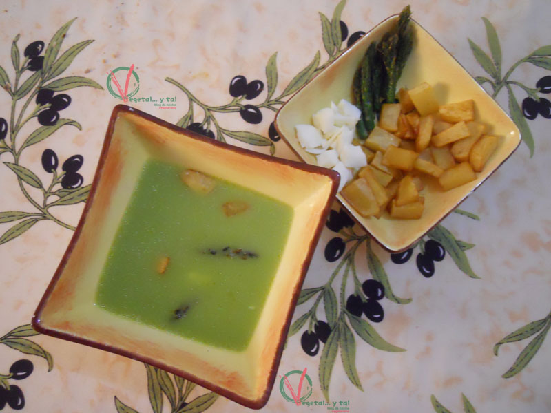 Lo de usar parte de la guarnición en caliente (las puntas de espárragos y las patatas) es algo diferente a lo que se usa en las sopas frías, que suelen llevar siempre guarniciones frías. Claro está que esta forma de poner la guarnición hace se pierda algo de frío la preparación. Si eres de los que te gusta bien frío el gazpacho puedes optar por usar cualquier otra guarnición.