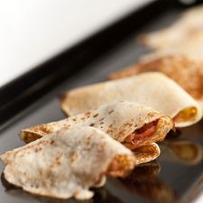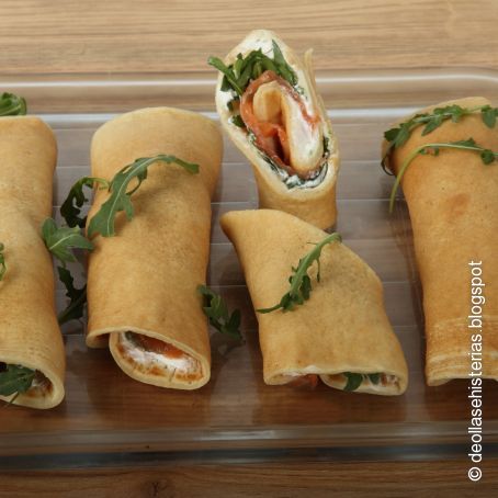Extiende el queso de untar en las crepês, pon un poco de rúcula y salmón y enróllalas. Puedes usar perfectamente otro rellenos, este es solo un ejemplo, la verdad es que así están muy ricas...