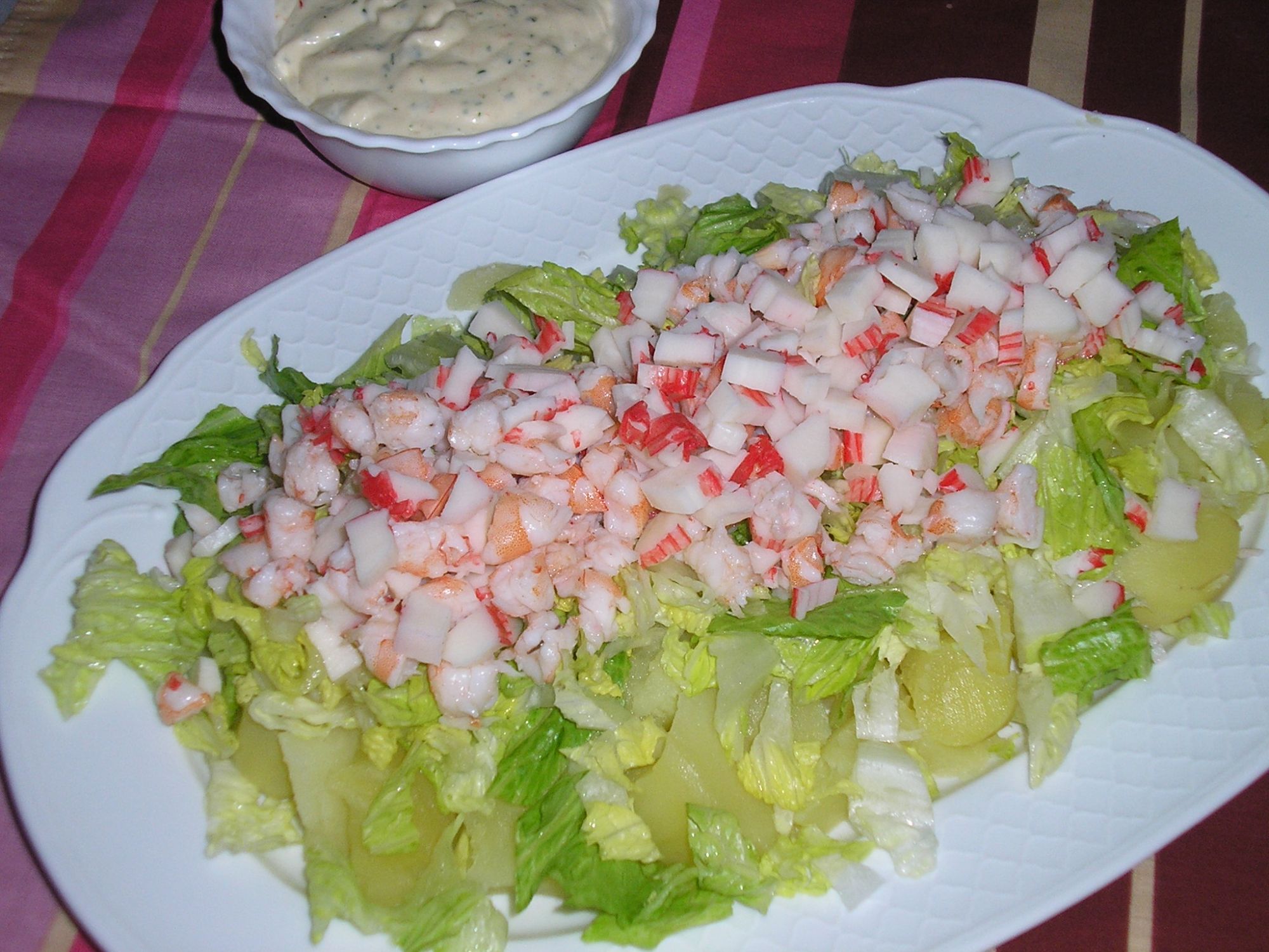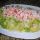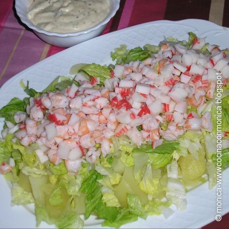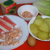 Despues pondremos por encima los langostinos cortados en trocitos pequeños y los palitos de cangrejo en rodajitas pequeñas, la aliñamos con un chorrito de aceite sal y el ajo en polvo.