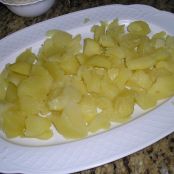 Cuando tengamos las patatas hervidas y frias las cortamos en trocitos y la ponemos en la base de la ensaladera.