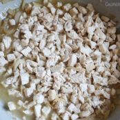 Cuando esté transparente la cebolla incorporamos el caldo de pollo y dejamos cocer, añadiendo las especias (una cucharada de perejil, una de agua de azahar, y otra de canela en polvo) durante unos 20 minutos. Una vez haya pasado este tiempo retiramos las pechugas y las cortamos en pedacitos pequeños, aunque también pueden desmigarse y las devolvemos a la sartén.