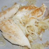 Cortamos la cebolla en tiras más o menos finas y en una sartén grande, echamos un poco de aceite de oliva, ponemos la cebolla y cuando empiece a dorarse añadimos las pechugas.