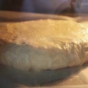La colocamos en una bandeja de horno en la que habremos dispuesto papel vegetal. De nuevo se puede pincelar con huevo (como hicimos nosotros) o mantequilla que también le dará un color dorado y hacemos un agujerillo en el centro para dejar salir el vapor.