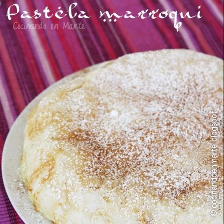 Este plato, propio de la gastronomía marroquí, consiste en un pastel de láminas de pasta filo relleno de carne de pollo desmigada junto con cebolla, almendra molida, agua de azahar, especias y luego espolvoreado con canela en polvo y azúcar glas, dándole un punto dulce al que no estamos acostumbrados pero que resulta especialmente agradable.