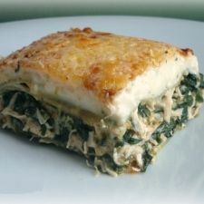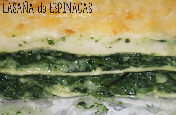 Una vez tengamos todoponemos a precalentar el horno a 200 º C y vamos montando la lasaña. Ponemos una capa de placas de lasaña en una fuente apta para horno, intercalando pasta en primer lugar, relleno de espinacas, placas, relleno de nuevo, placas otra vez y en último lugar una capa bechamel. Sobre la que extendemos el queso para gratinar por encima.