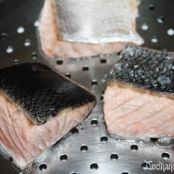Empezamos cortando el salmón en las porciones según las raciones que se vayan a usar. Es importante desespinar y retirar todas las escamas, aunque normalmente son cosas que el pescadero lo puede hacer sin problemas. Cuando ya lo tengamos, ponemos el salmón salpimentado con la piel hacia arriba en una olla al vapor que ya esté caliente y lo mantenemos dentro unos 3 ó 4 minutos, más o menos hasta que cambie de color (tiene que quedar crudo por dentro aún).